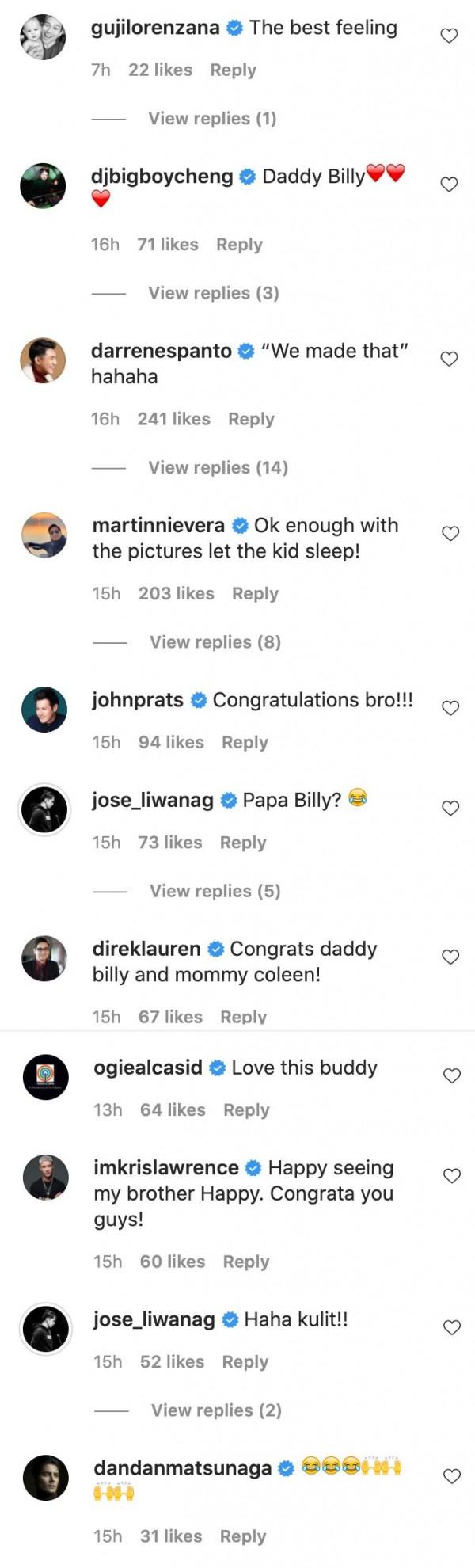 Celebrity friends continue to shower Billy with congratulatory messages and welcome him to parenthood.