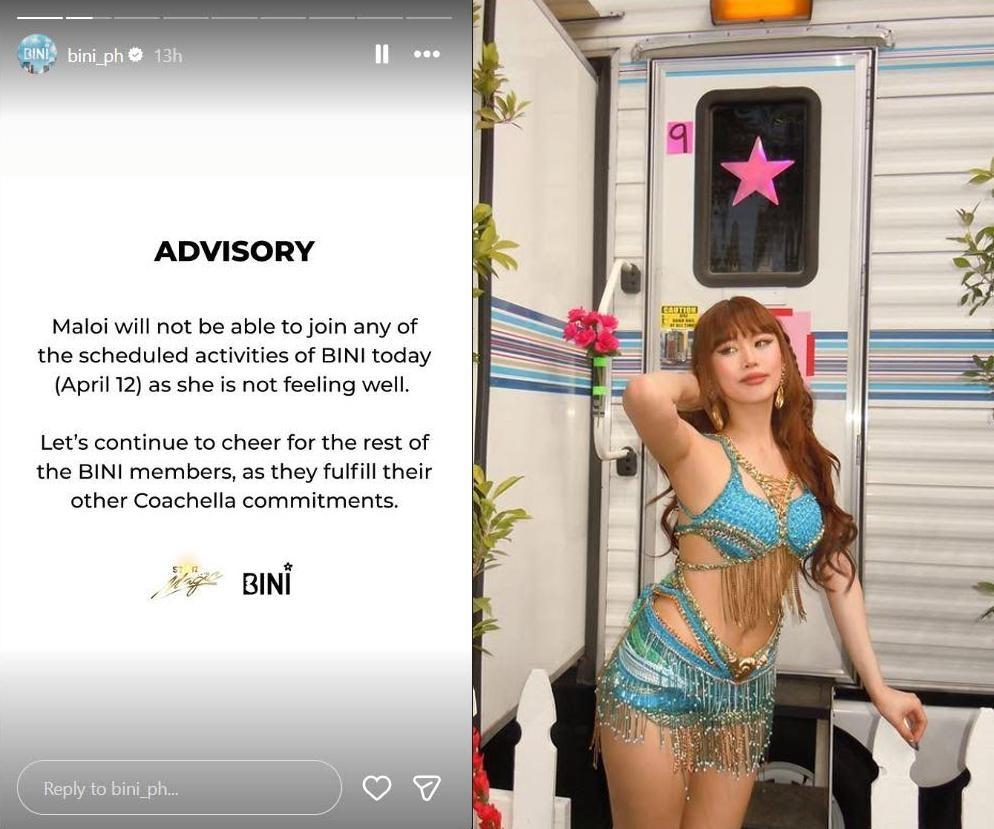 The statement reads, “Maloi will not be able to join any of the scheduled activities of BINI today (April 12- US Time) as she is not feeling well.”