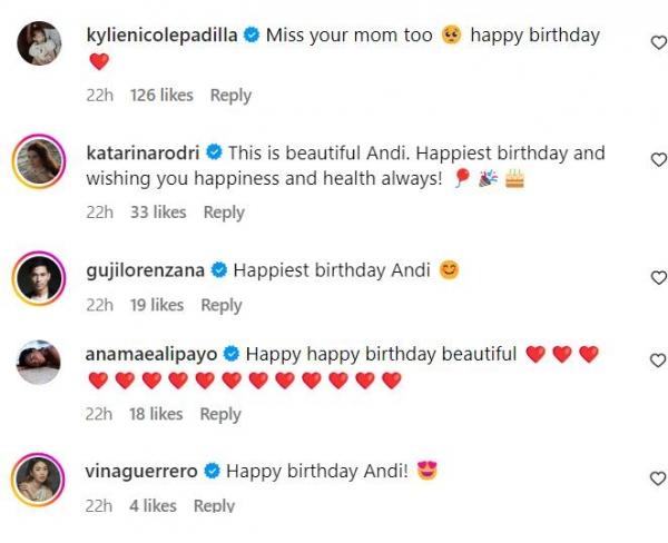 Kapuso actress Kylie Padilla reacted to Andi's post and told her that she misses her Nanay Jane, too. Beauty queen Katarina Rodriguez wished Philmar Alipayo's fiancée a happy birthday as well.