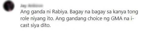 “Ang ganda ni Rabiya. Bagay na bagay sa kaniya 'tong role niyang ito. Ang gandang choice ng GMA na i-cast siya dito,” komento ng isang netizen.