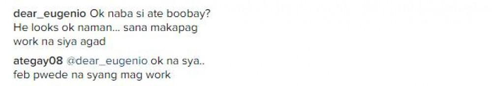 Kinumpira rin ni Ate Gay o Gil Morales na malapit nang makabalik sa trabaho si Boobay.