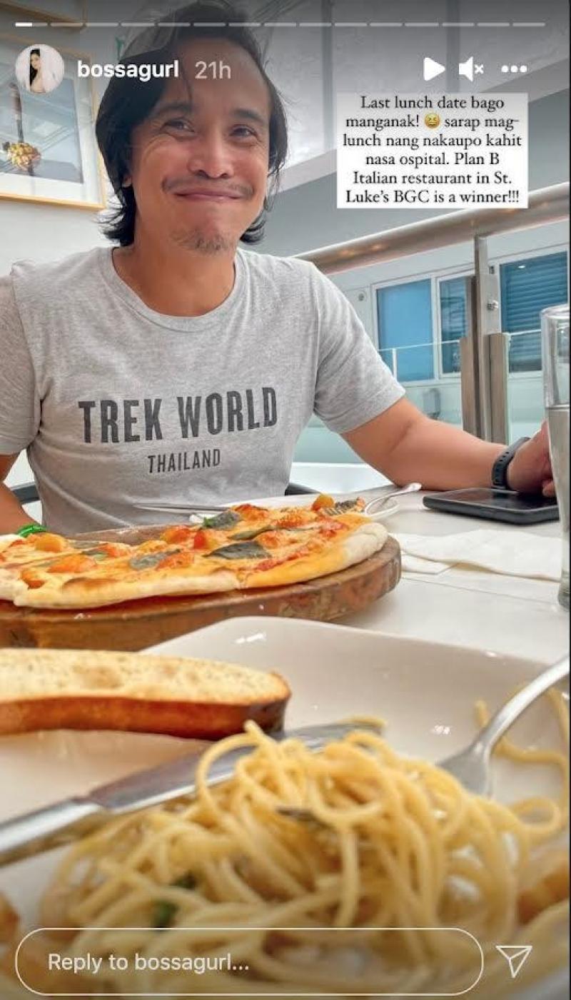 “Last lunch date bago manganak! sarap mag-lunch nang nakaupo kahit nasa ospital. Plan B Italian restaurant in st. Luke's BGC is a winner!!!” sulat ni Sitti kalakip ang larawan ng asawa.