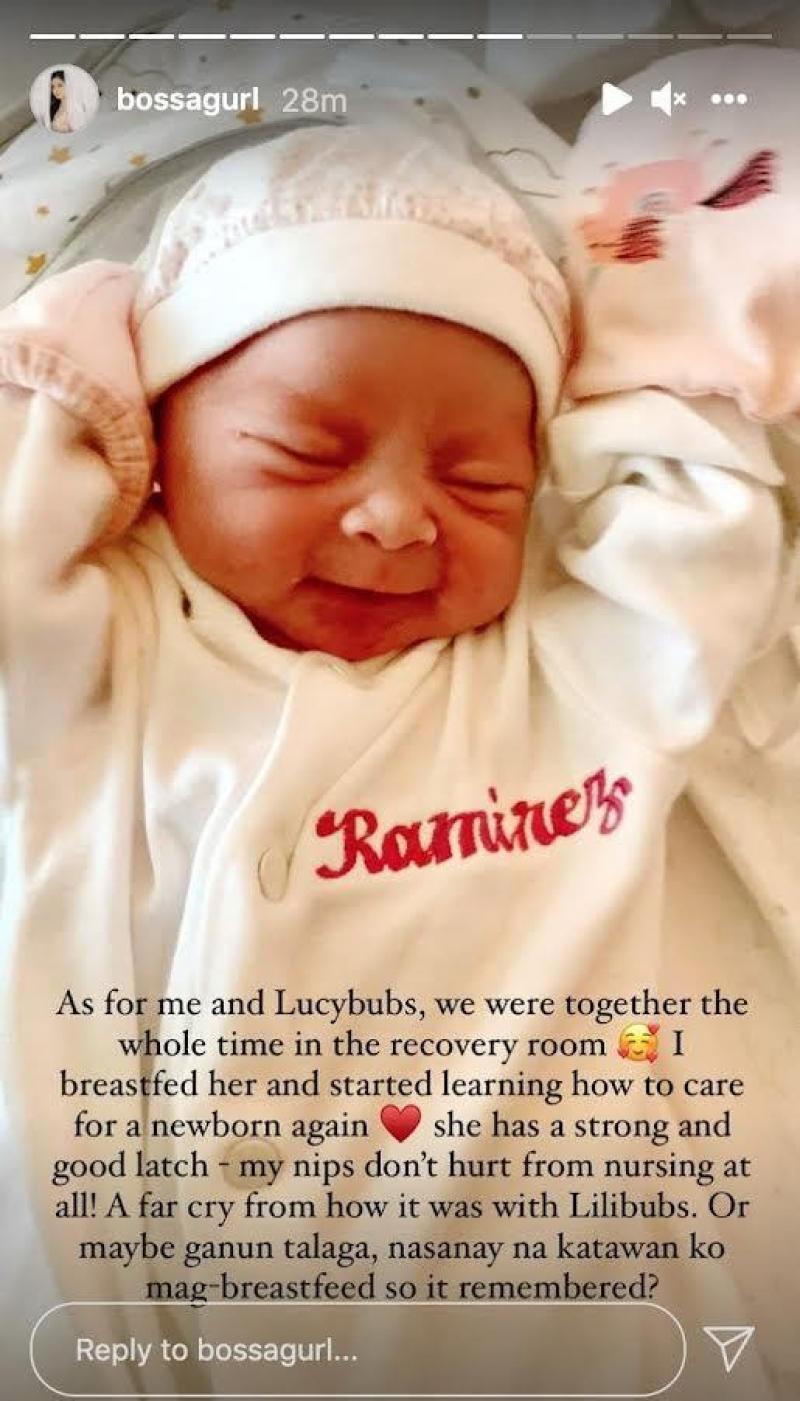 “As for me and Lucybubs, we were together the whole time in the recovery room. I breastfeed her and started learning how to care for a newborn again. She has a strong and good latch - my nips don't hurt from nursing at all! A far cry from how it was with Lilibubs. Or maybe ganun talaga, nasanay na katawan ko mag-breastfeed so it remembered?” update ng Singer.