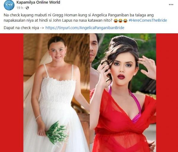 “Na-check kayang mabuti ni Gregg Homan kung si Angelica Panganiban ba talaga ang napakasalan niya at hindi si John Lapus na nasa katawan nito?” post sa isang Facebook page.