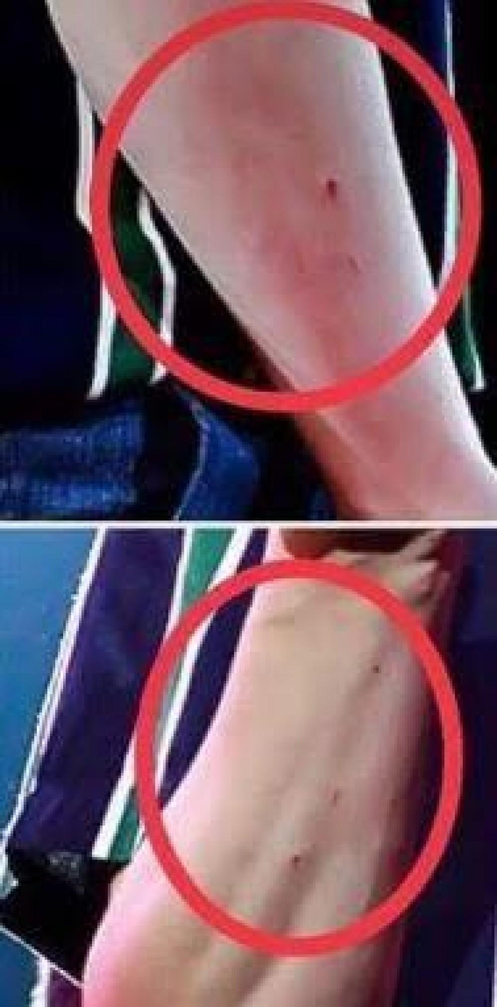 A photo of the actor's arms during the press conference, held hours before the event, even shows that the Korean star already had the marks on his arms.