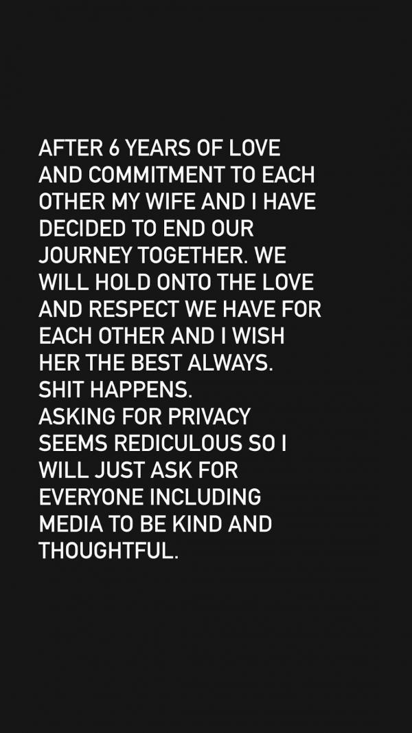 “After 6 years of love and commitment to each other my wife and i have decided to end our journey together,” Sam wrote on his Instagram Story on Friday. “We will hold onto the love and respect we have for each other and I wish her the best always. S**t happens.”