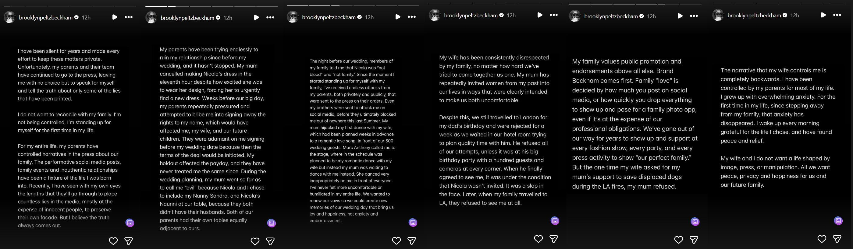 "I have been silent for years and have made every attempt to keep these matters private. Unfortunately, my parents and their team have continued to go to the press, leaving me with no choice but to speak for myself and tell the truth about only some of the lies that have been printed," Brooklyn wrote in a multi-slide post on Instagram Stories. "I do not want to reconcile with my family. I'm not being controlled, I'm standing up for myself for the first time in my life."