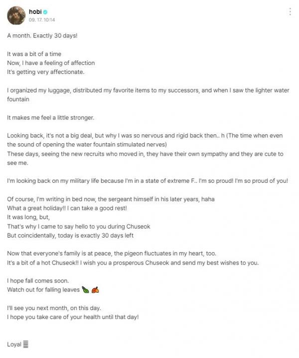 According to AllKPOP, J-Hope's message read, "One month, exactly 30 days! Time felt so slow, but now I've grown attached to it. As I clean up, giving my well-used items to my juniors and seeing my emptied locker, I feel more sentimental."