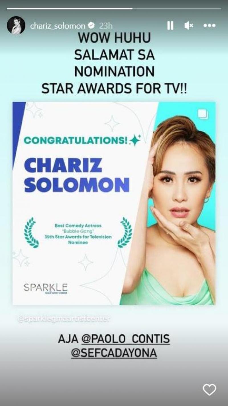 Post ni Chariz sa Instagram Story, “Wow. Huhu salamat sa nomination Star Awards for TV!”