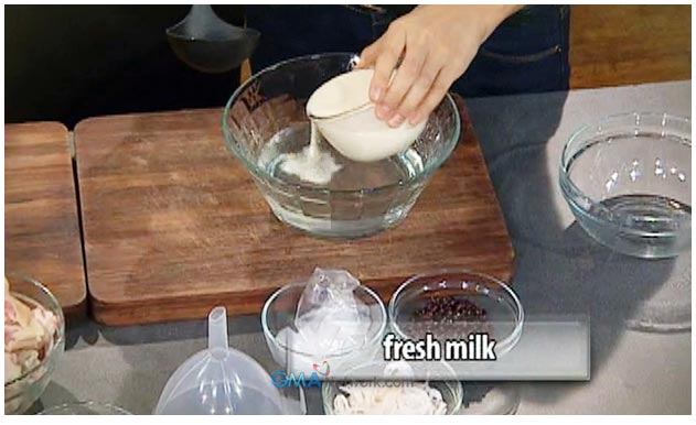 1. Combine coconut water, fresh milk, condensed milk and pandan extract in a mixing bowl. Stir until well-combined.