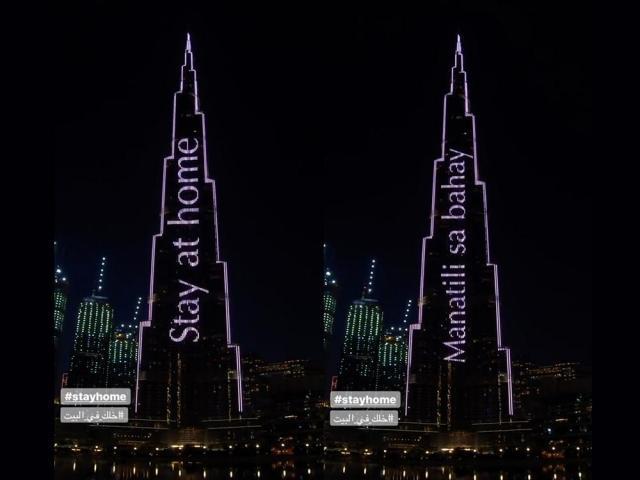 World's tallest building Burj Khalifa reminds people to stay at home in Filipino and several other languages amid the COVID-19 pandemic through its display of light.