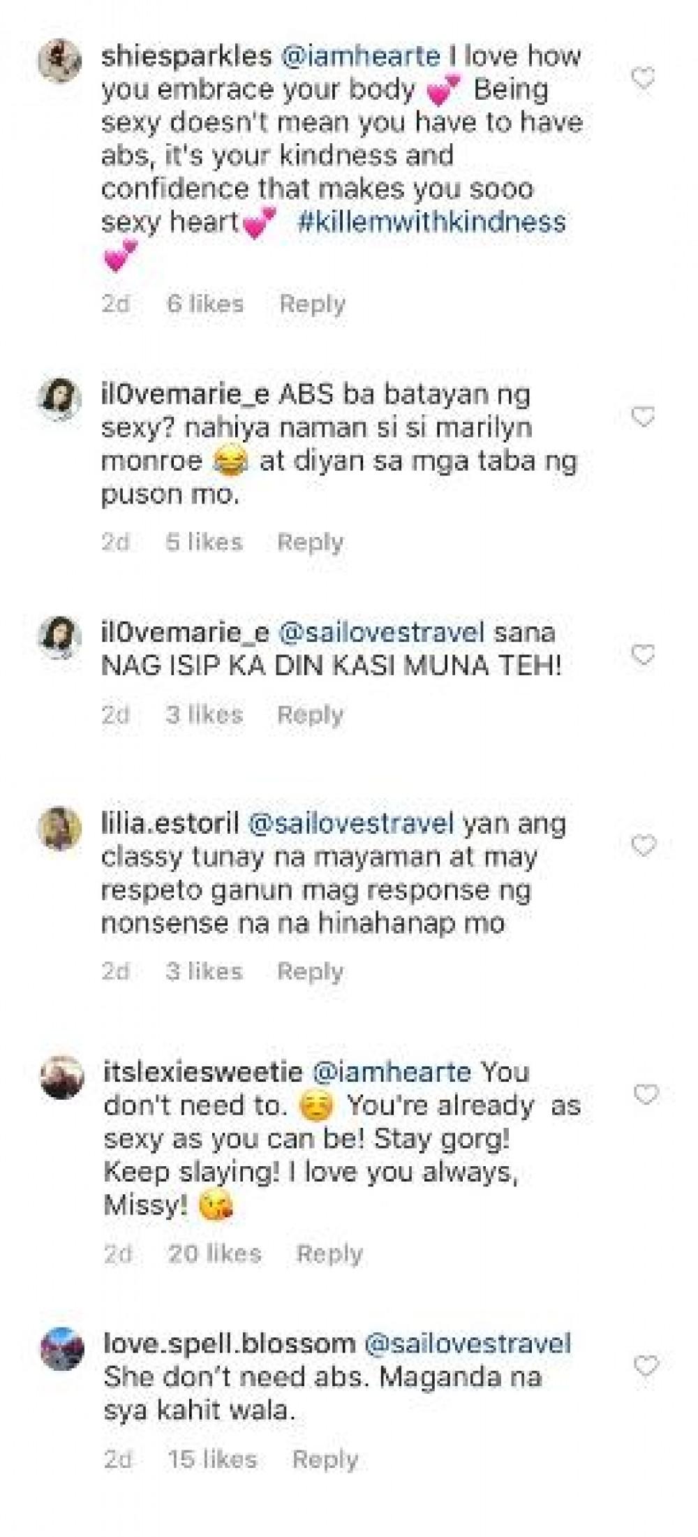 In a recent exchange of messages with a netizen, Heart responded to a comment about her not having any abs.