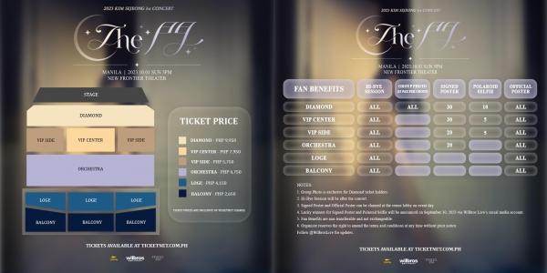 Tickets are priced at PhP9,950 (Diamond), PhP7,950 (VIP Center), PhP5,750 (VIP Side), PhP4,750 (Orchestra), PhP4,150 (Loge), PhP2,650 (Balcony), all with fan benefits.