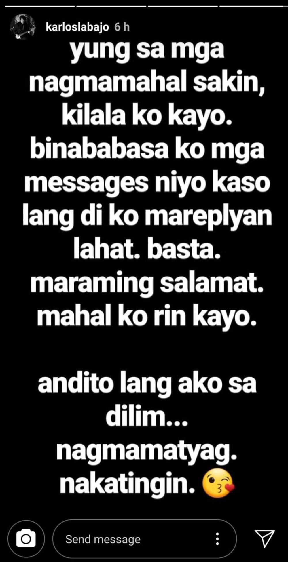 “Yung sa mga nagmamahal sa akin, kilala ko kayo. Binabasa ko message niyo kaso lang di ako mareplyan lahat. Basta, maraming salamat, mahal ko rin kayo.”