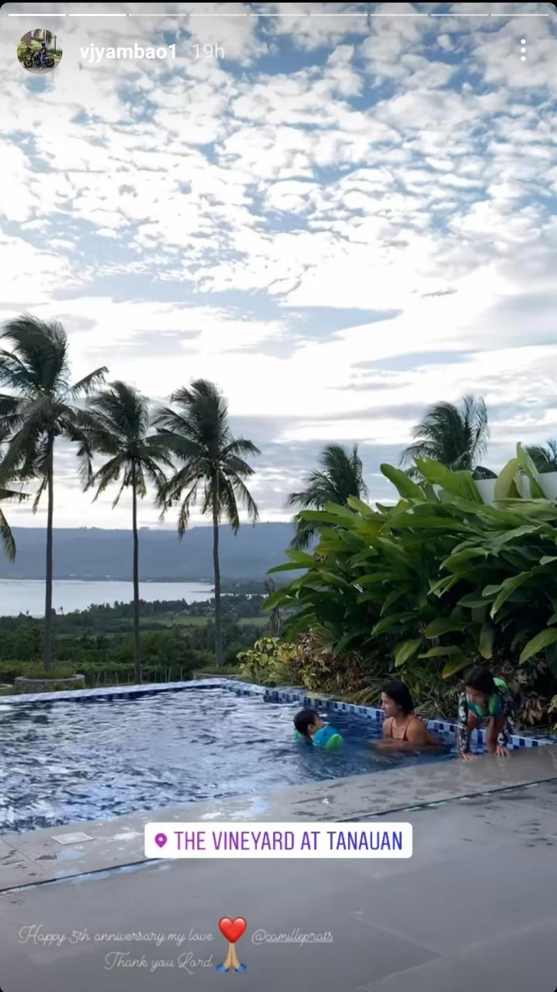 Camille's husband, VJ, took to social media a short video of his wife having a great time at the pool with their kids and wrote, “Happy 5th anniversary, my love @camilleprats. Thank you, Lord.”