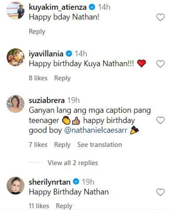 Camille's showbiz colleagues such as Iya Villania, Kuya Kim Atienza, Suzi Abrera, and Sherilyn Reyes-Tan extended their birthday greetings for Nathan in the comments section.