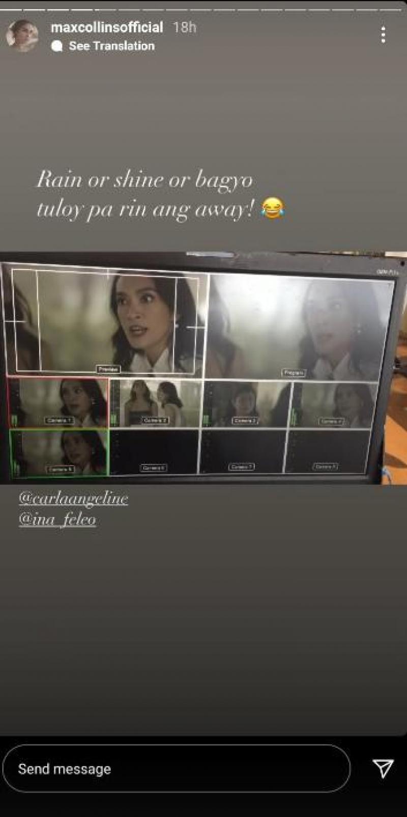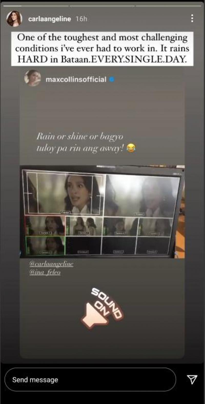 Sa Instagram Story ni Carla, ibinahagi niya na sabak pa rin sila sa taping nina Max at Ina Feleo, kahit matindi ang ulan.