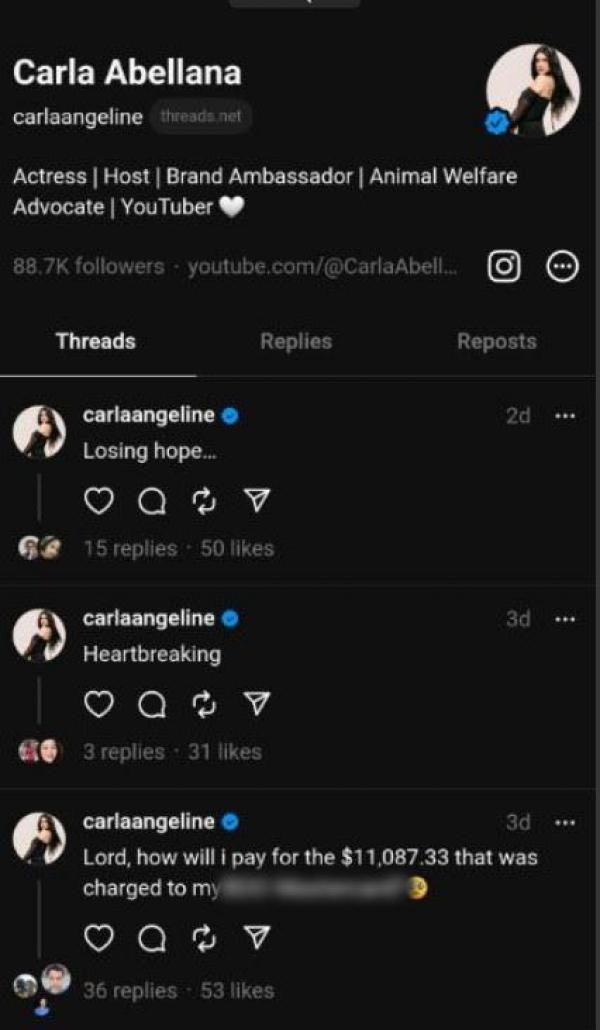 Stolen Life actress Carla Abellana expressed her frustration about a certain transaction charged to her personal credit card.