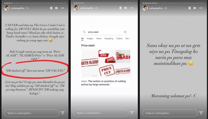 Nilinaw ni Carla Abellena ang presyo ng kanyang condo unit sa Pasig na ibinebenta niya ngayon, "Paki-Google na rin po ang term na 'PRICE SLASH.'"