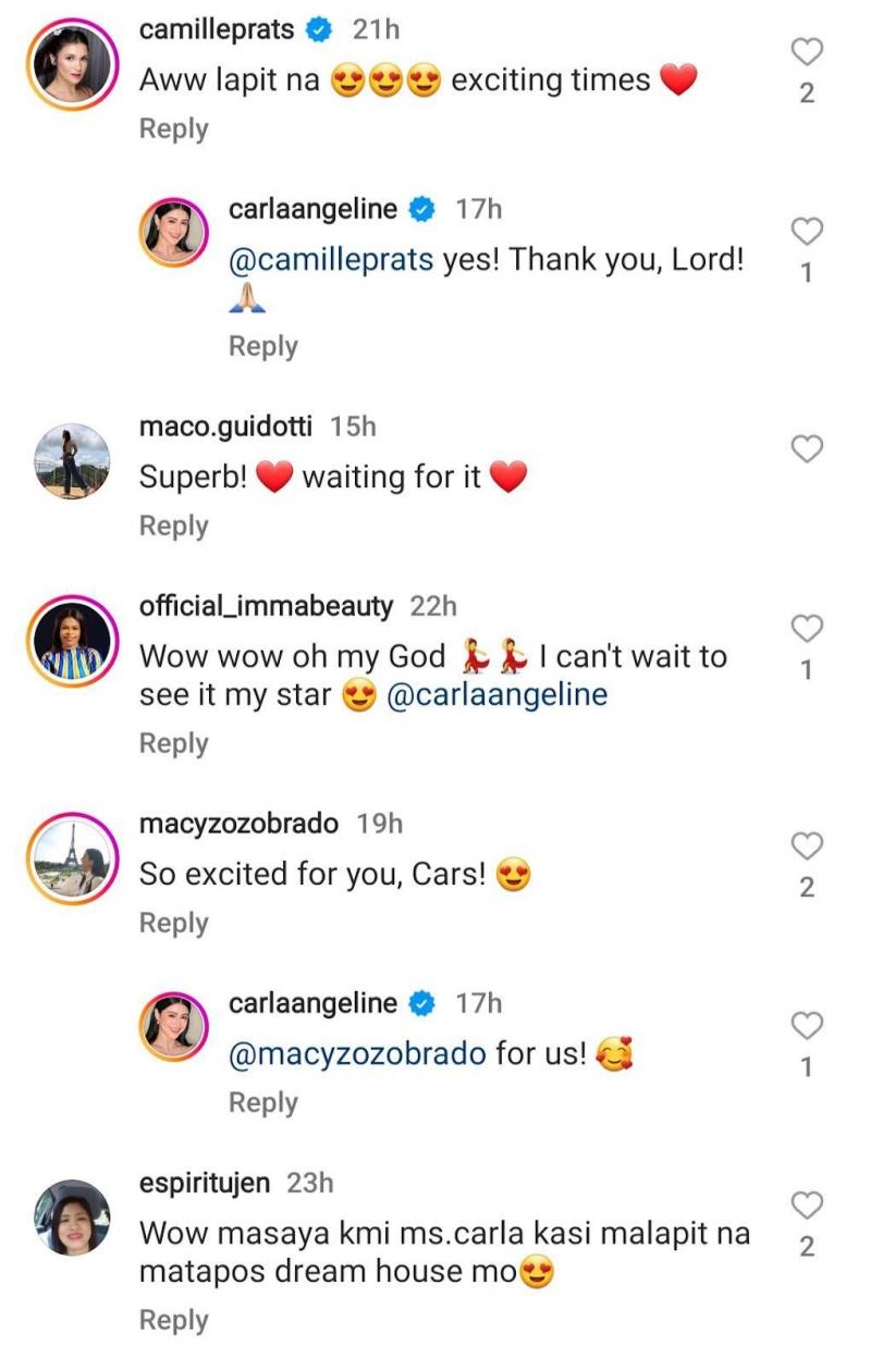 Meanwhile, in the comments section, some of her fans, including fellow Kapuso actress Camille Prats also expressed their happiness and excitement for Carla in achieving one of her dreams.