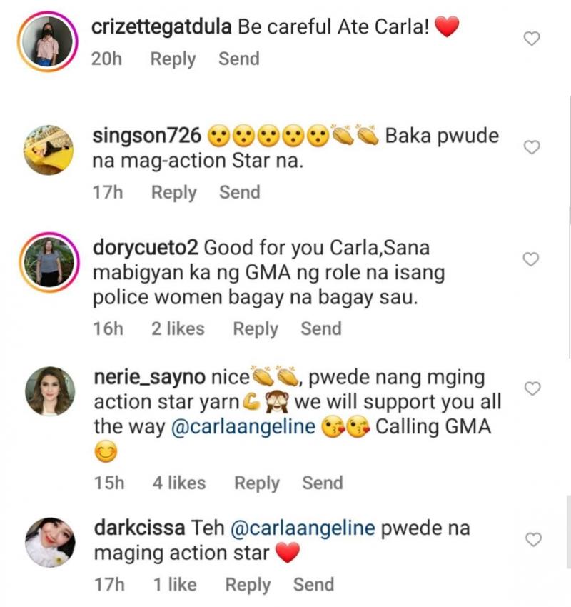 “Nice, pwede nang mging action star [yan]. We will support you all the way @carlaangeline. Calling GMA,” @nerie_sayno commented.