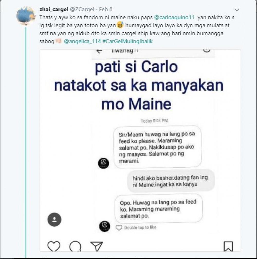 Former DIVA star Carlo Aquino quickly defended Dubsmash Queen of the Philippines Maine Mendoza against the malicious comments of an Internet troll.
