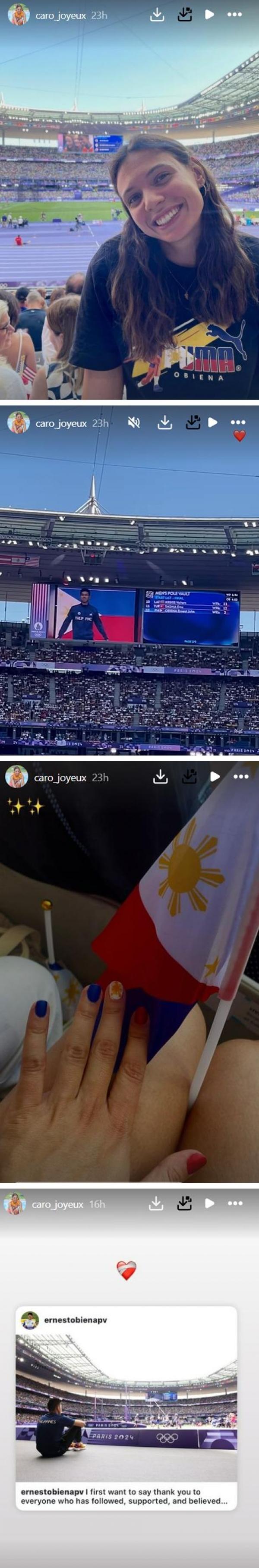 German athlete and triple jumper Caroline Joyeux shared photos of her watching EJ during his Men's Pole Vault Finals match on August 6, 2024.