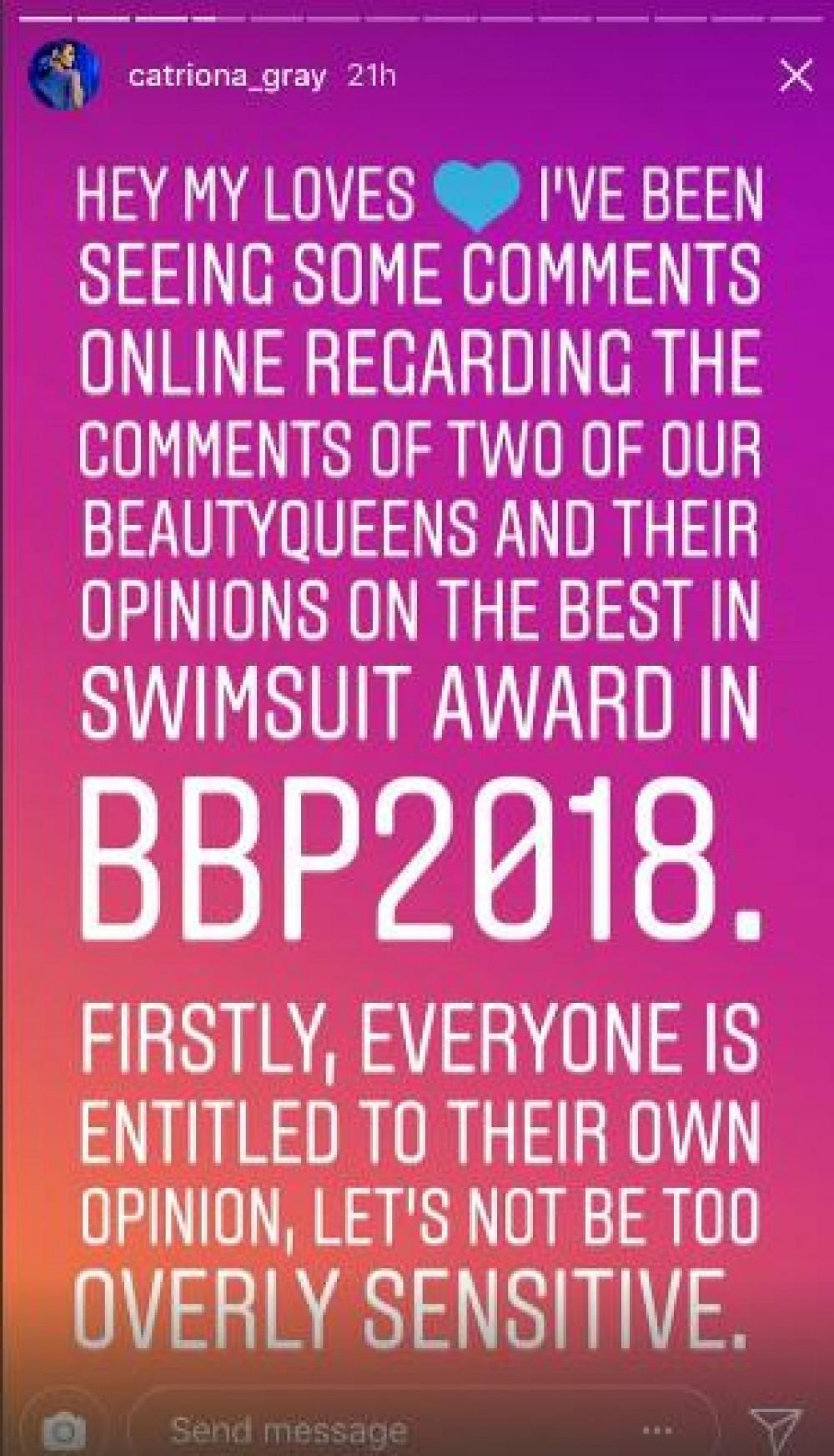 Newly-crowned Miss Universe Philippines Catriona Gray breaks her silence over the controversial comments of two former beauty queens about her winning in the swimsuit category during the Binibining Pilipinas coronation night.