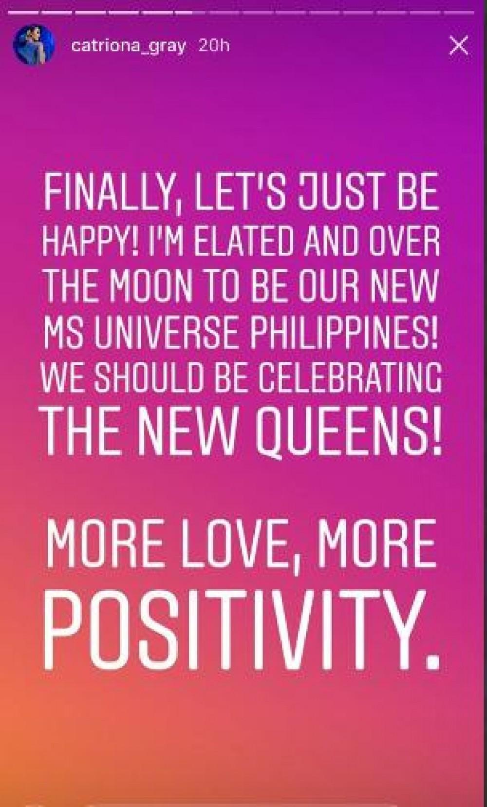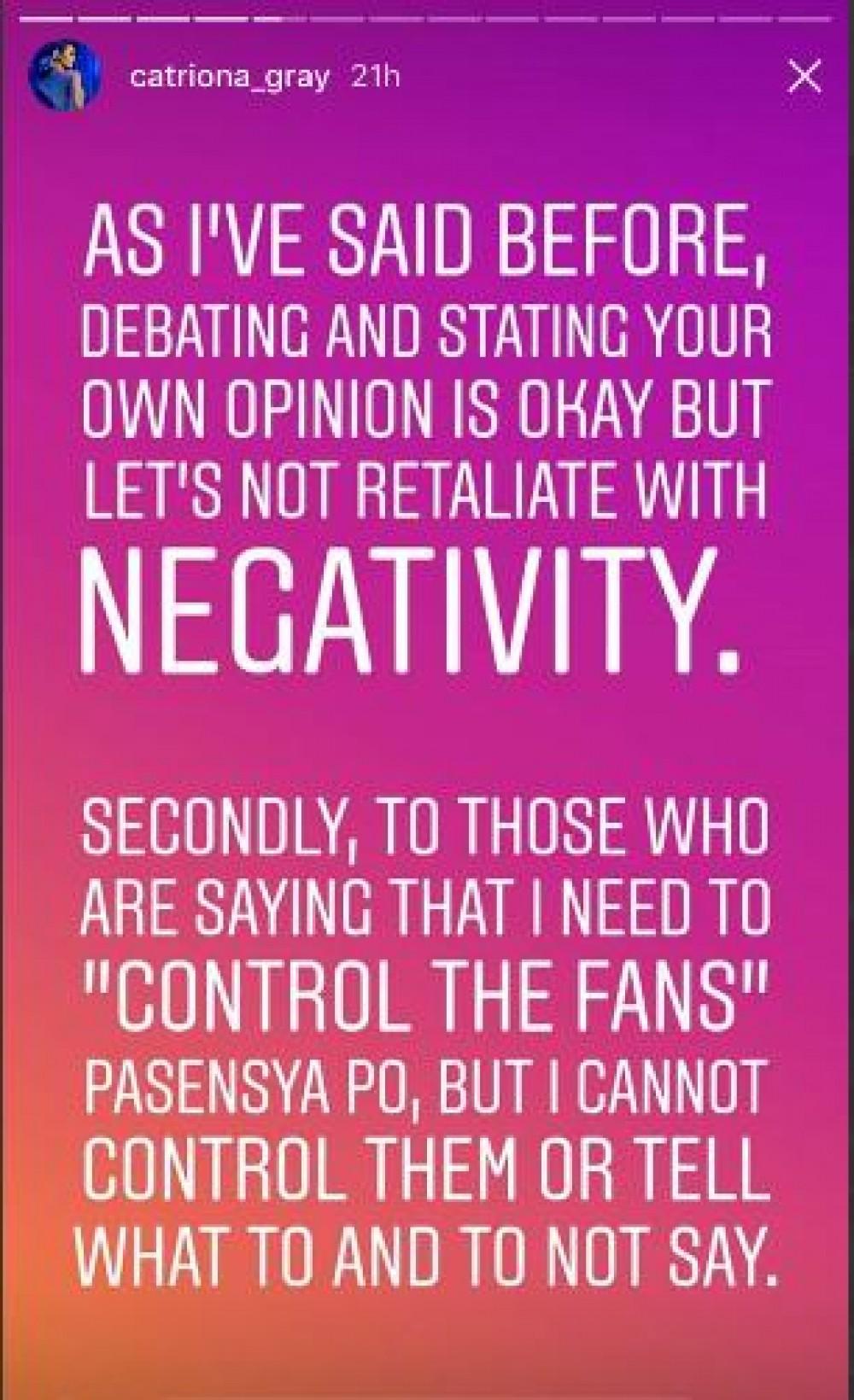 Catriona who was also a former Miss World Philippines posted these following messages on her Instagram stories. She asked her fans to stop spreading negativity online but was quick to admit that she has no power to control them on “what to or not to say” in social media.