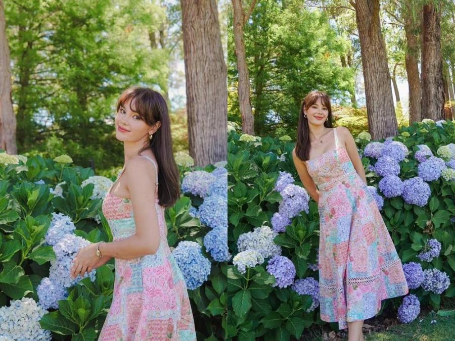 In an Instagram post, the beauty queen bloomed in her patchwork-inspired midi dress as she posed among the hydrangeas.