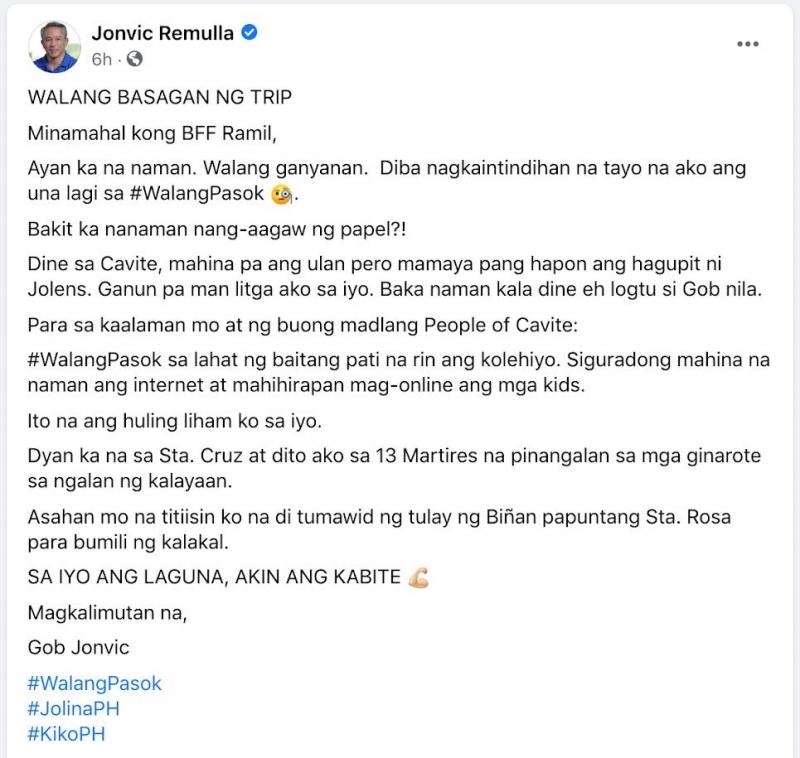 Kinaaliwan ng netizens ang sagutan nina Cavite Governor Jonvic Remulla at Laguna Governor Ramil Hernandez tungkol sa class suspension.