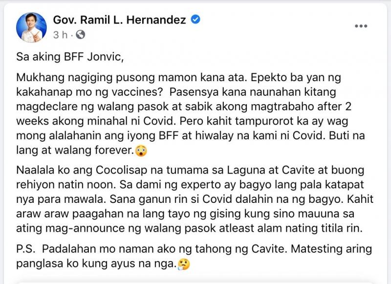Sumama raw ang loob ni Gov. Remulla sa Facebook post na ito dahil may usapan na pala ang dalawa na ang Cavite dapat ang mauunang magsuspinde ng klase. Kaya naman ganito na lamang ang kaniyang naging mensahe sa kaibigan.