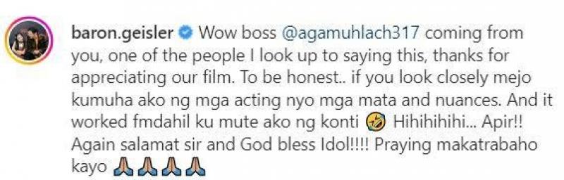 "Wow boss @agamuhlach317 coming from you, one of the people I look up to saying this, thanks for appreciating our film. To be honest.. if you look closely mejo kumuha ako ng mga acting nyo mga mata and nuances. And it worked fm dahil ku mute ako ng konti Hihihihihi... Apir!! Again salamat sir and God bless Idol!!!! Praying makatrabaho kayo," ani Baron.