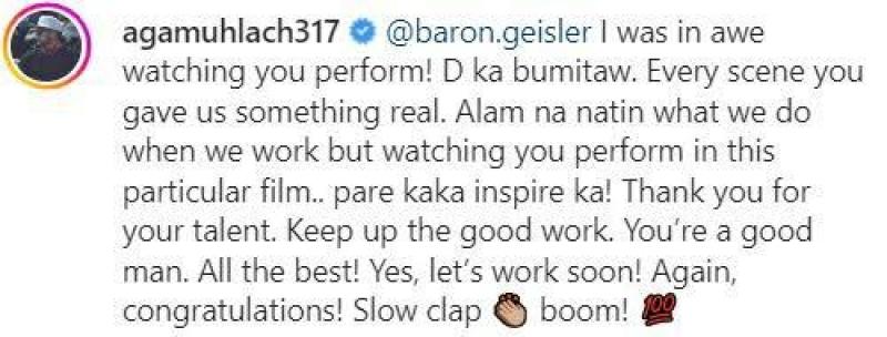 Aniya, "@baron.geisler I was in awe watching you perform! Di ka bumitaw. Every scene you gave us something real. Alam na natin what we do when we work but watching you perform in this particular film.. pare kaka inspire ka! Thank you for your talent. Keep up the good work. You're a good man. All the best! Yes, let's work soon! Again, congratulations! Slow clap boom!"