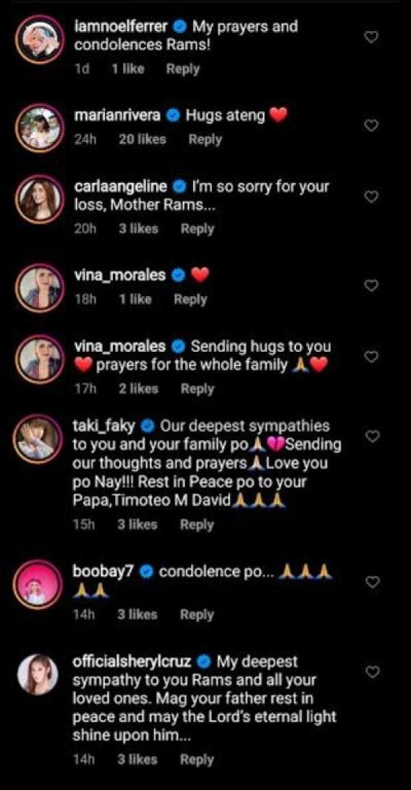 Several celebrities also reacted to Rams David Instagram post to extend their condolences to his family like Kapuso Primetime Queen and Triple A talent Marian Rivera, comedian Boobay, and primetime actress Carla Abellana.