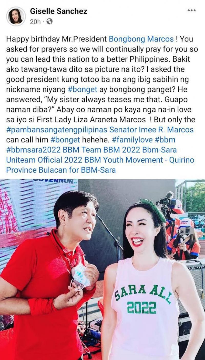 Giselle also took time to express her warm birthday greeting to President Bongbong through a Facebook post.