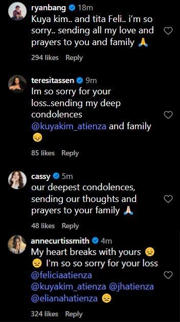 Dumagsa ang iba't ibang miyembro ng Filipino entertainment industry sa Instagram post ni Felicia Atienza kung saan binalita ng pamilya Atienza ang pagpanaw ni Status by Sparkle star Emman Atienza.