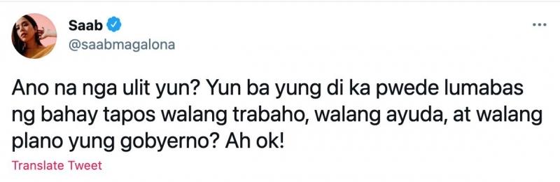 She said, “Ano na nga ulit 'yun? 'Yun ba 'yung 'di ka pwede lumabas ng bahay tapos walang trabaho, walang ayuda, at walang plano 'yung gobyerno? Ah, ok!”