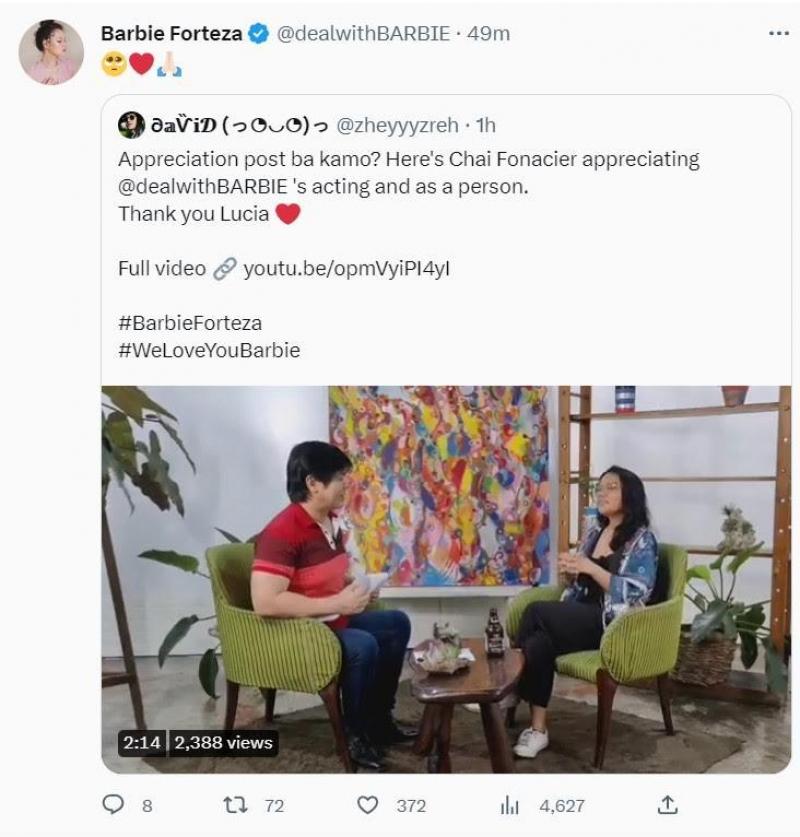 Taos-puso naman ang pasasalamat ni Barbie nang mapanood ang panayam ni Chai Fonacier sa post nito sa Twitter ngayong Biyernes.
