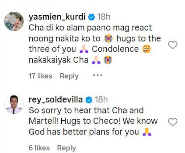 Even Yasmien's husband, Rey Soldevilla was saddened over the death of Charee's baby. He said, “ So sorry to hear that Cha and Martell! Hugs to Checo! We know God has better plans for you”