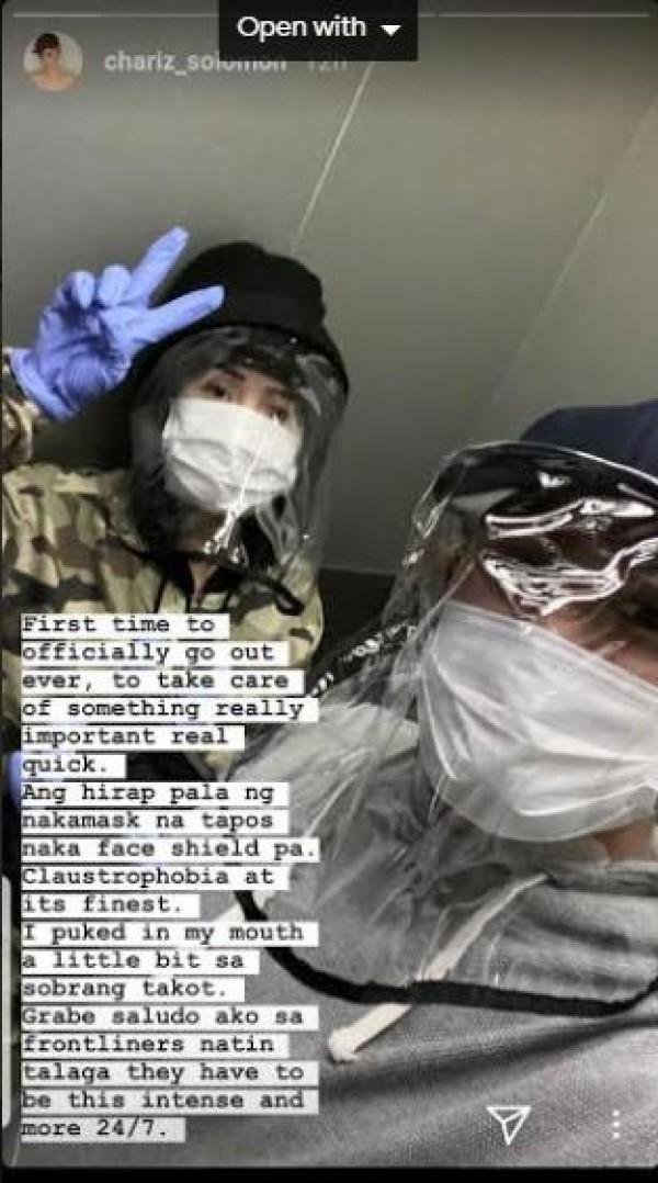 In her Instagram Story yesterday, April 23, Chariz said that it was her first time to go outside and she had to wear a facemask and face shield to protect herself.