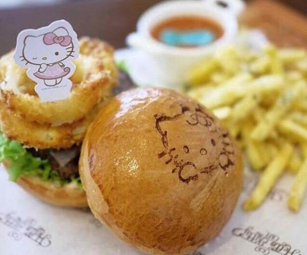 Burgeresse is a meat patty topped with fried onion rings and melted cheese sandwich in between a Hello Kitty-stamped brioche buns.