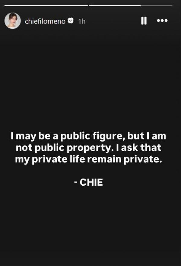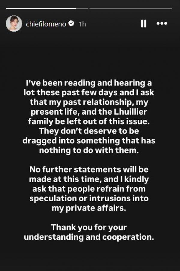 In an Instagram Story earlier, September 29, Chie said, "I've been reading and hearing a lot these past few days and I ask that my past relationship, my present life, and the Lhuillier family be left out of this issue. They don't deserve to be dragged into something that has nothing to do with them.