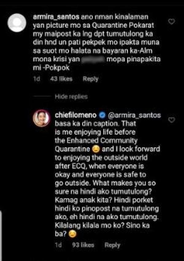 Chienna Filomeno did not think twice to defend herself after a basher chastised her for Instagram post about the enhanced community quarantine being implemented by the government.