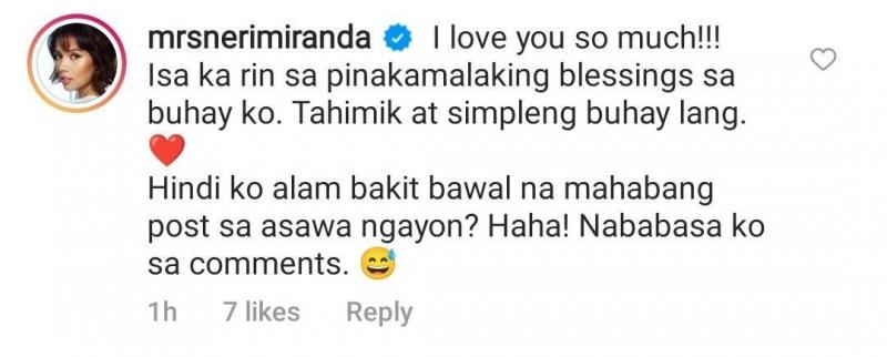 “Hindi ko alam bakit bawal na mahabang ppost sa asawa ngayon? Haha! Nababasa ko sa comments,” Neri said.