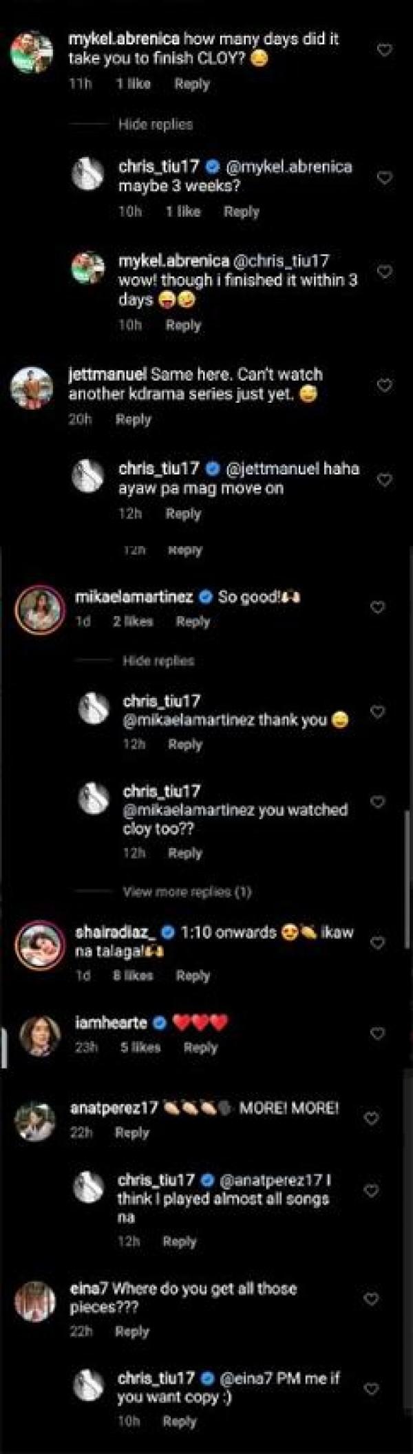 Marami namang netizens ang napabilib ni Chris Tiu. Kahit mga artista tulad nina Heart Evangelista at Shaira Diaz ay nagustuhan ang kanyang piano cover.