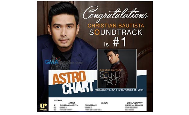 After a successful back-to-back album launch on November 15 and 16 in Eastwood City and Market! Market!, Christian Bautista effortlessly made his way to the top of the charts as Soundtrack claimed the number one spot in Astroplus' Astro Chart for the week of November 10 to 16, 2014.