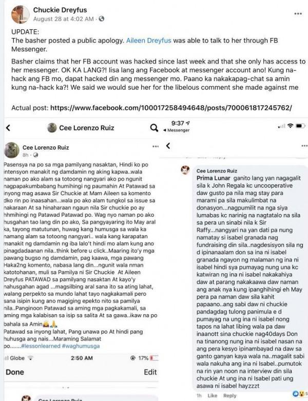 “Muli, sa pamilya ni Sir Chuckie at Aileen Dreyfus, patawad. Magsilbing aral sana ito sa ating lahat na walang perpekto sa mundo lahat tayo nagkakamali pero sana isipin kung ano magiging epekto sa pamilya nila.”
