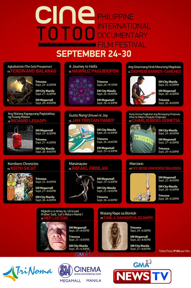 GMA News TV launches the first edition of "CINE TOTOO: Philippine International Documentary Film Festival" in theaters this September 24 to 30. Viewers will be treated to an interesting line-up of documentaries, produced by 11 independent filmmakers from all over the country.