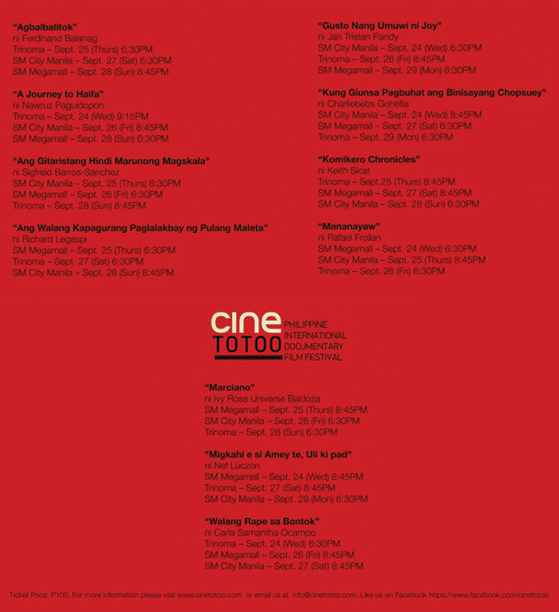 Starting September 24 to 30, 11 Cine Totoo documentaries will be screened in SM Mega Mall, SM Manila, and Trinoma Cinemas. Here is the complete screening schedule of the Filipino films in competition at the first Philippine International Documentary Film Festival.